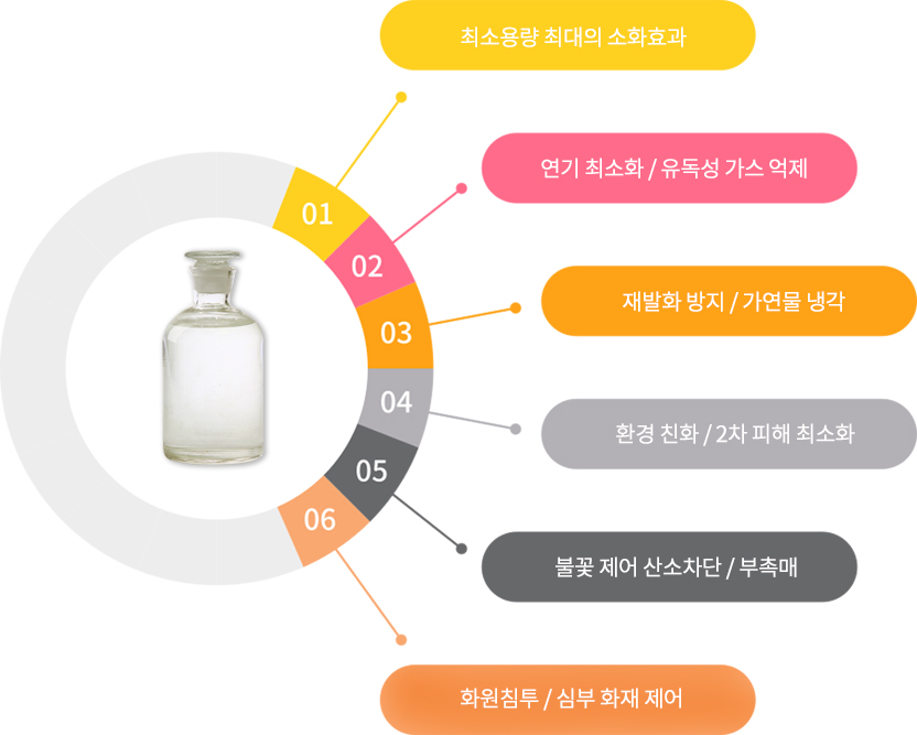 - 물의 침투 기능을 극대화 한 소화약제로서, 분말 및 가스 계 소화약제가 접근하지 못하는 심부 화재에도 효과적입니다.