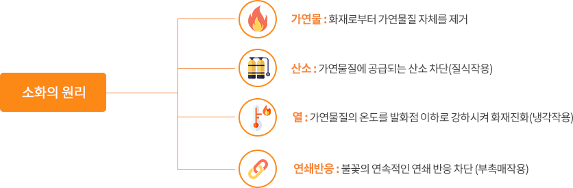 - 소화란 이들 화재의 요인 중 한 가지 이상을 화원으로부터 제거하는 것을 말합니다.