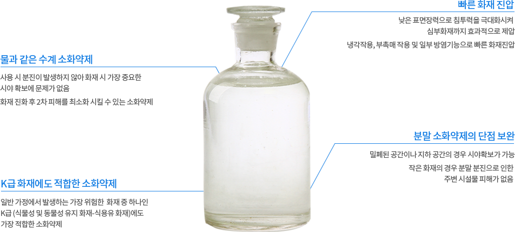 | 적용처 | 스프레이식 소화기 주방용 자동식 소화 설비 기타 소화 설비 | AB급 강화액 소화기 투척용 소화용구 설비용 소화약제 | K급 소화기 상업용 주방 자동소화장치 |