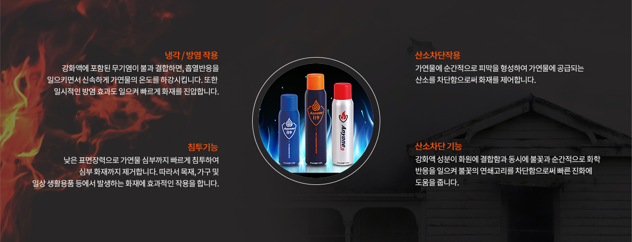 - 냉각,침투,부 촉매,산소차단 등의 효과를 발휘함으로 초기화재 진화에 매우 효과적입니다.
